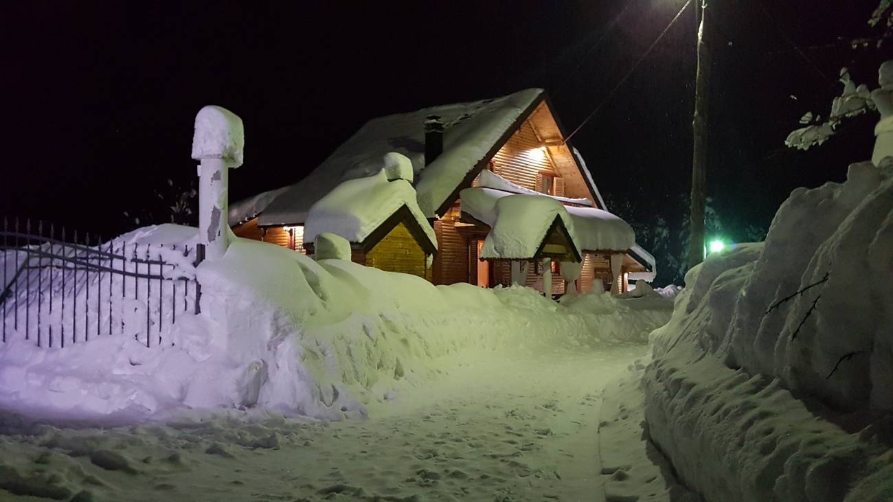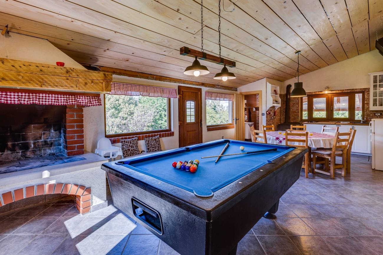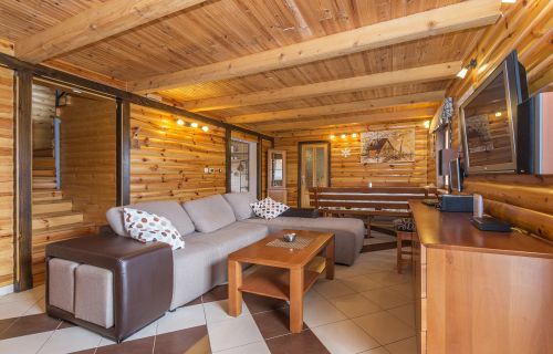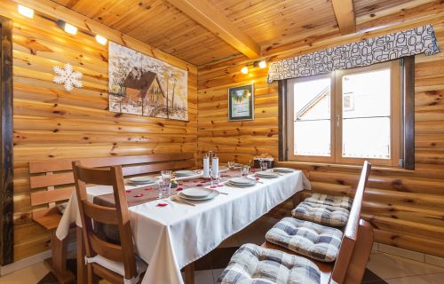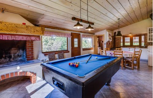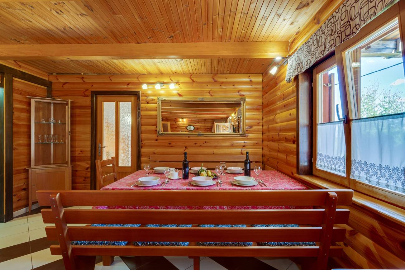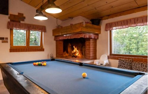 Iza drvenih vrata skriva se prava mala oaza za druženje – konoba. Opremljena peći na drva i otvorenim ognjištem, prostorom za pripremu hrane, biljarom i udobnim kutkom za uživanje uz piće i glazbu. Bez obzira gledate li kroz staklene stijene sunčanu prirodu ili snježnu bajku, atmosfera je uvijek topla i opuštena.